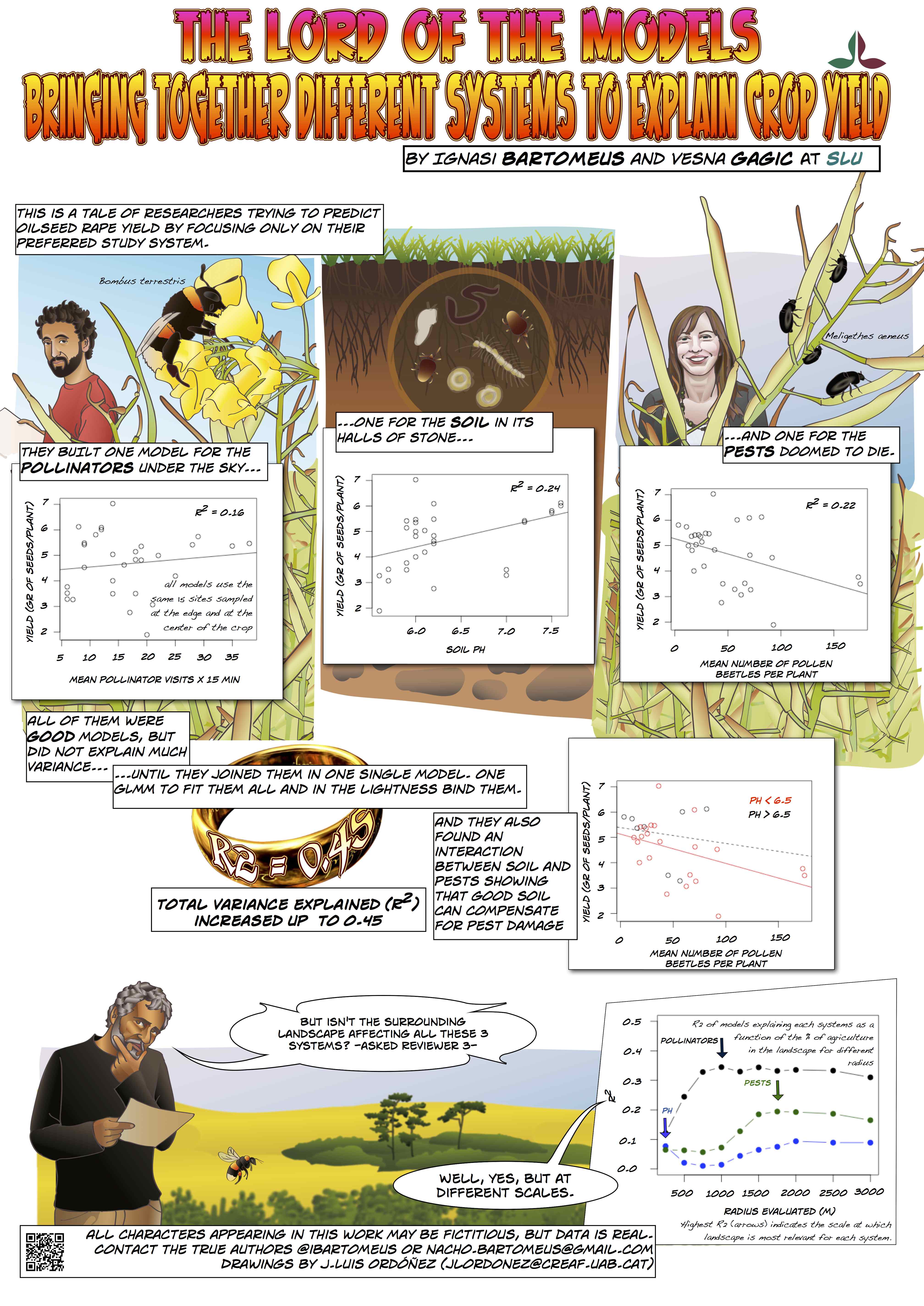 I have been exploring how to effectively communicate my results and engage with the audience. I just attended this week the Nordic Oikos meeting and presented a risky poster explaining one of my side projects in a comic stile. But I did one very clever thing: Partner with an artists (and friend, and scientific). I designed the outline and place a first draft of the graphs and text. Then I asked him to do whatever he wants on the cartoons to illustrate pollinators, soil, pests… He could choose the drawing technique and in summary, he had absolute freedom. It was so amazing that he even place myself and Vesna in the poster!